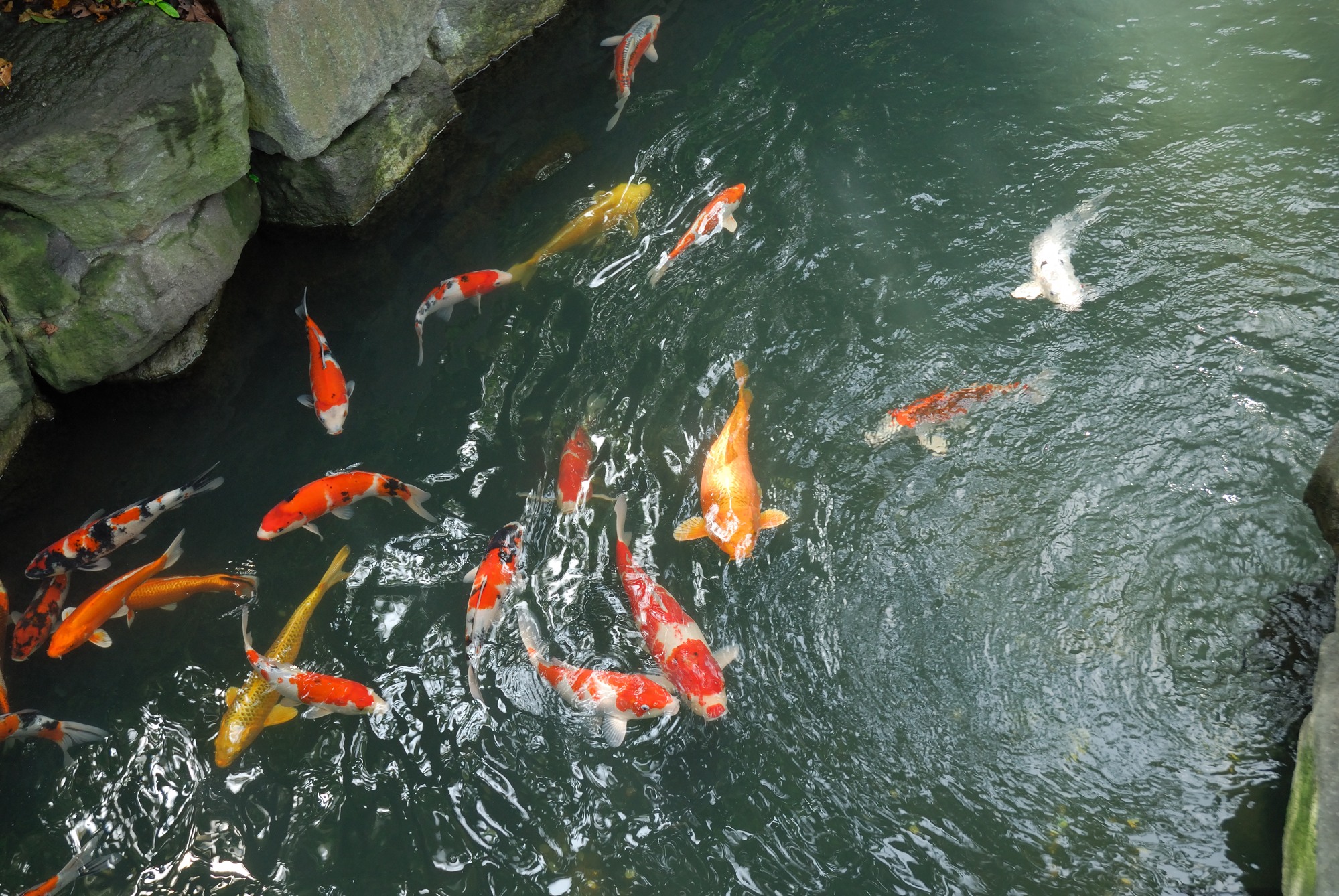 そこから今度は左(西方向)に進んでみます。その先には赤い壁面が綺麗な影向堂(ようごうどう)がありますが、その手前に小さな橋が架かっており、そこから下を見ると見事な鯉がたくさん泳いでいました。ここでもまたちょっぴり感動です。