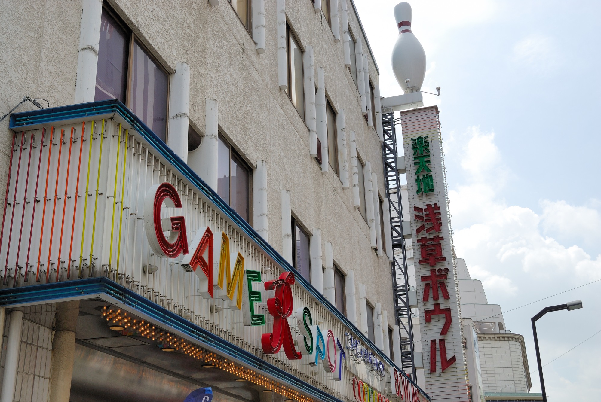 気を取り直して先に進むと、左右にとても古い感じですが派手な看板があります。右にあったのは「ROCKZA」と書いてありロック座と読めますが、良く見るとパチスロ屋のようです。左には浅草ボウルがありました。いずれも中には入りませんでしたが、ラスベガスを思わせるような派手な電飾が印象的で、夜は綺麗だろうなと思いました。