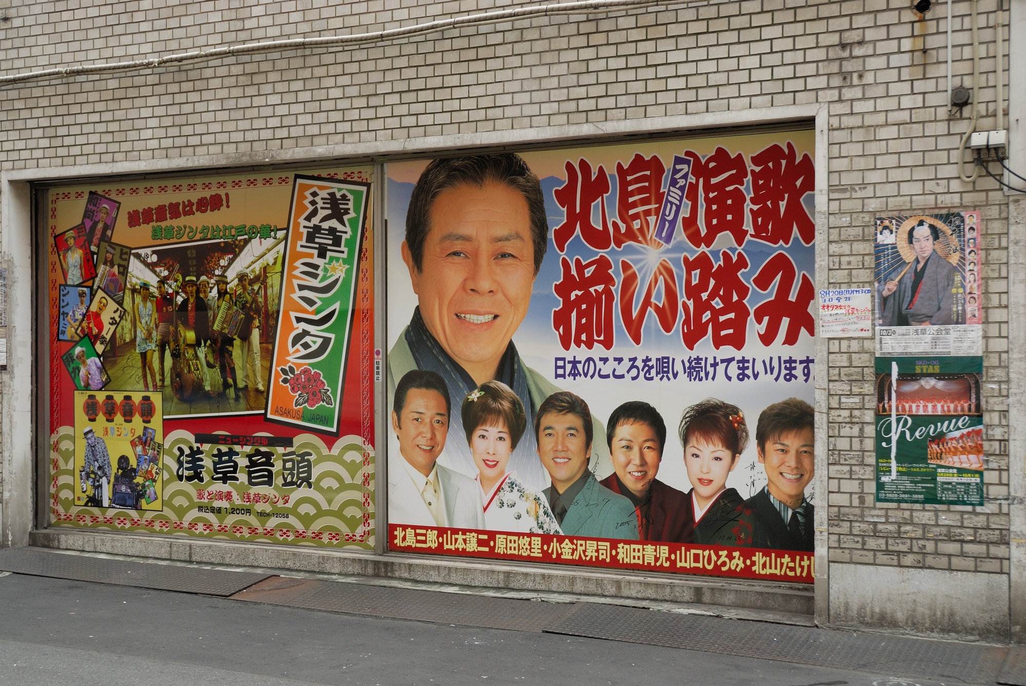少し歩いた所で、建物の横に大きな絵が書かれており、見ると北島三郎や浅草ジンタと書かれていました。