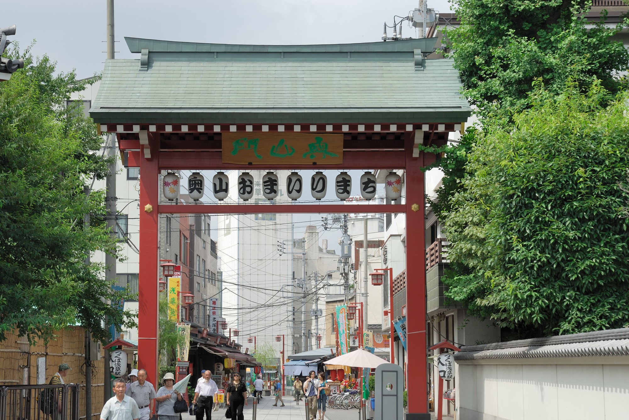 この本堂、なかなか立派なものです。正面にはやはり大きな赤い提灯があり「志ん橋」と書かれています。写真を撮った後、一応拝みます。手前には線香を上げる台もあり、外人さんがそこで拝んでいたりしました。向かって左側にはお札やお守りを売る場所が並んでいます。この本堂の後ろに回ってみると人が少なく、日陰になっているせいか、とても涼しかったので、そこで小休憩しました。