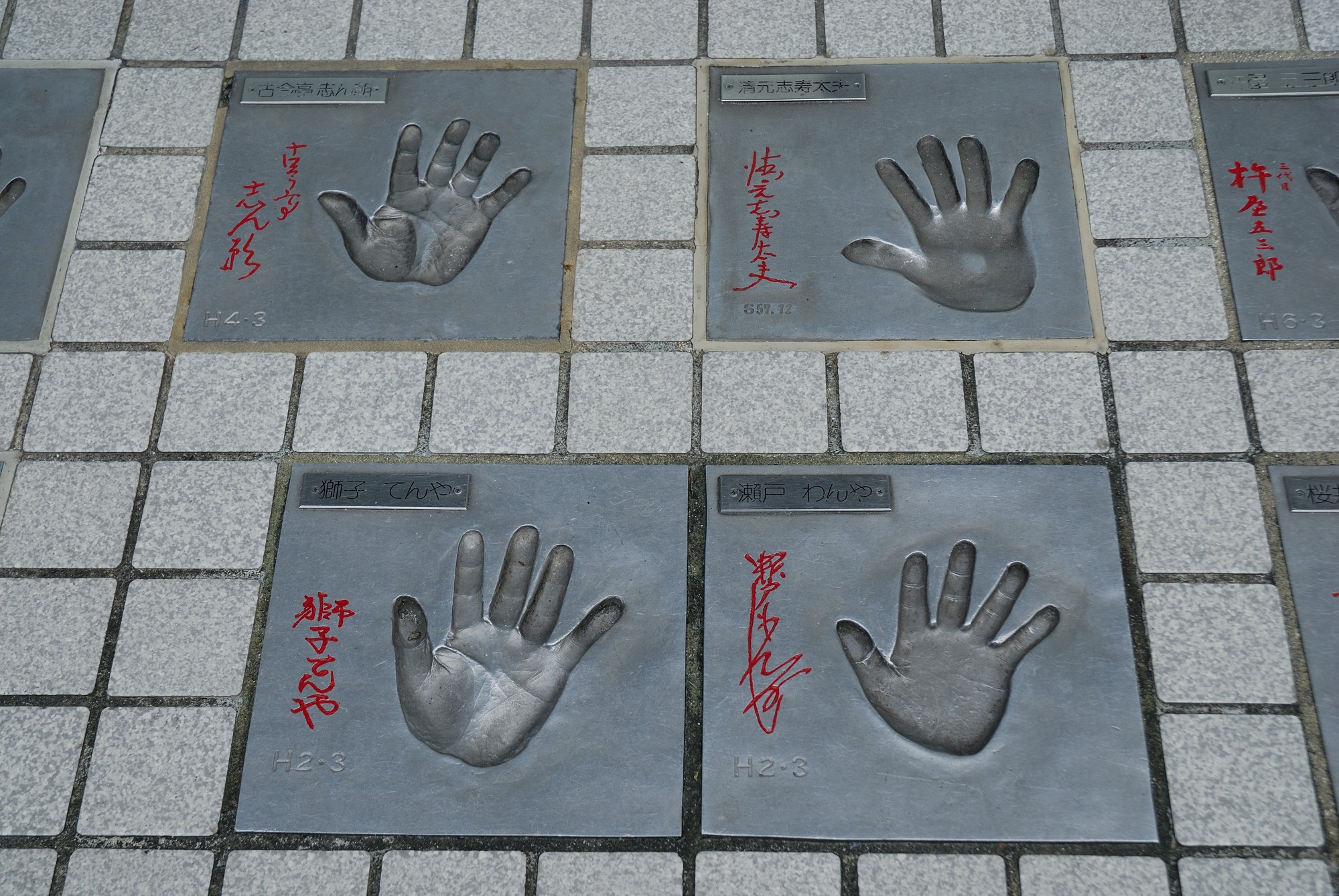 いやー、いかにも浅草らしいなあ、と思いつつ記念写真をパチリです。また、公会堂の正面の歩道には、多くの有名人の手形が埋め込まれていました。