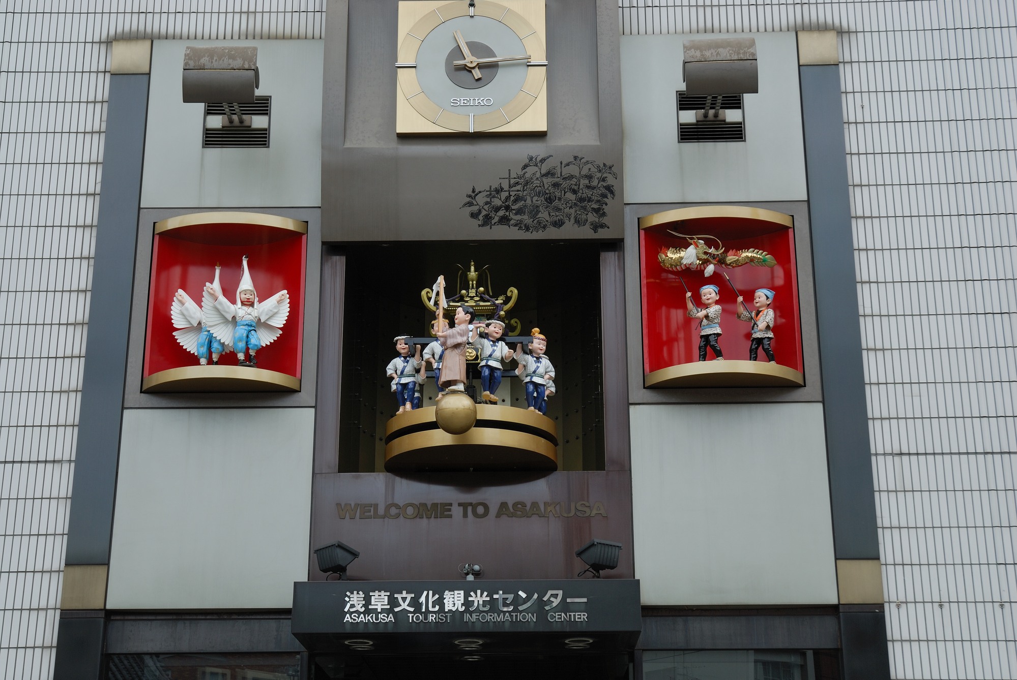 さて雷門通りを歩くと、ほどなく元の雷門の前に出てきます。そこから雷門の向かい側には、浅草文化観光センターがありますが、その正面にあるからくり時計はちょっと凝った作りになっています。調べたら、以前、故郷創生で全国の全ての自治体に1億円が国から支給されたことがありましたが、その1億円で作られたとのことです。何とも豪華な時計で、毎時0分には音とともに人形が動くそうです。