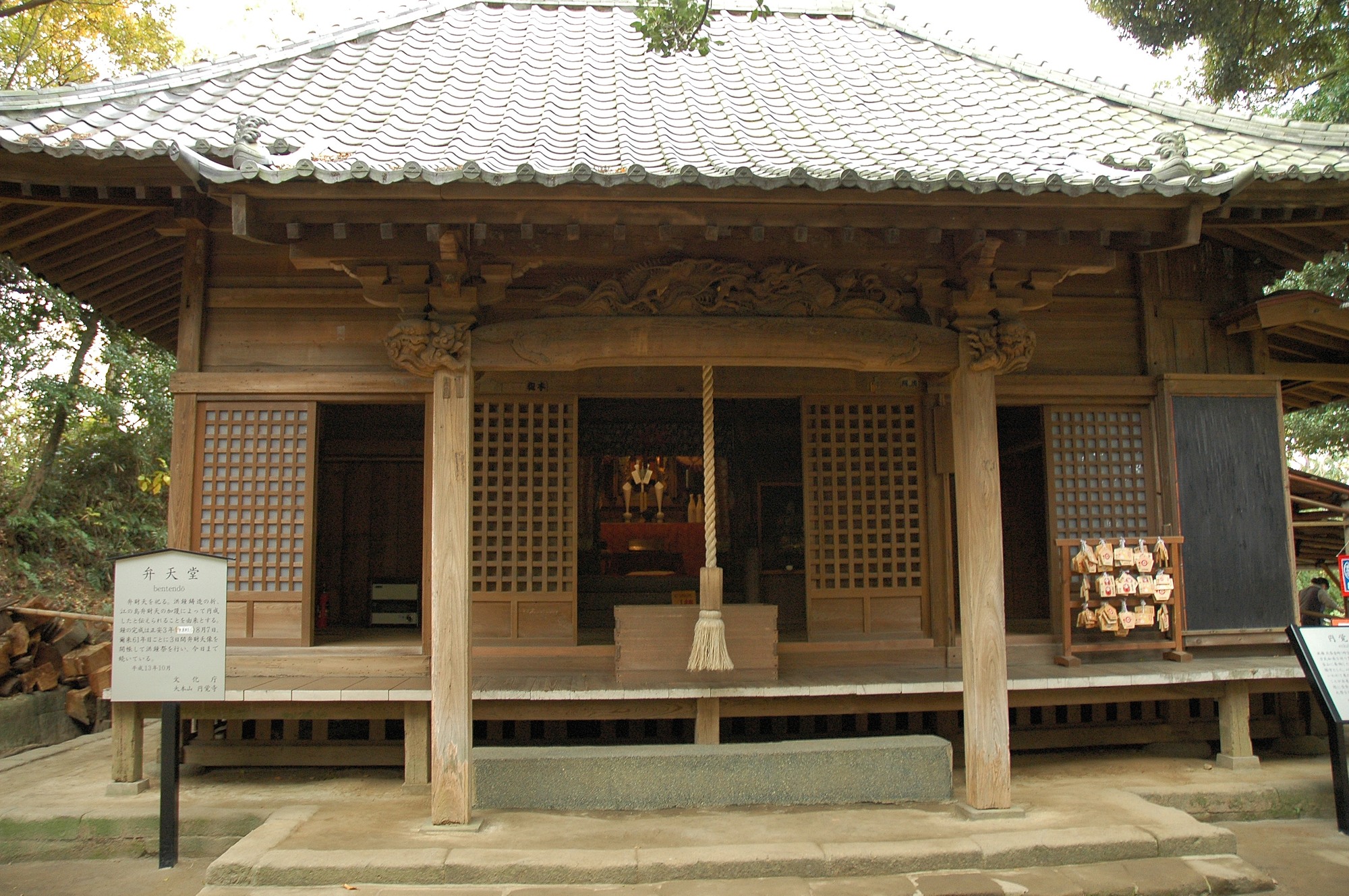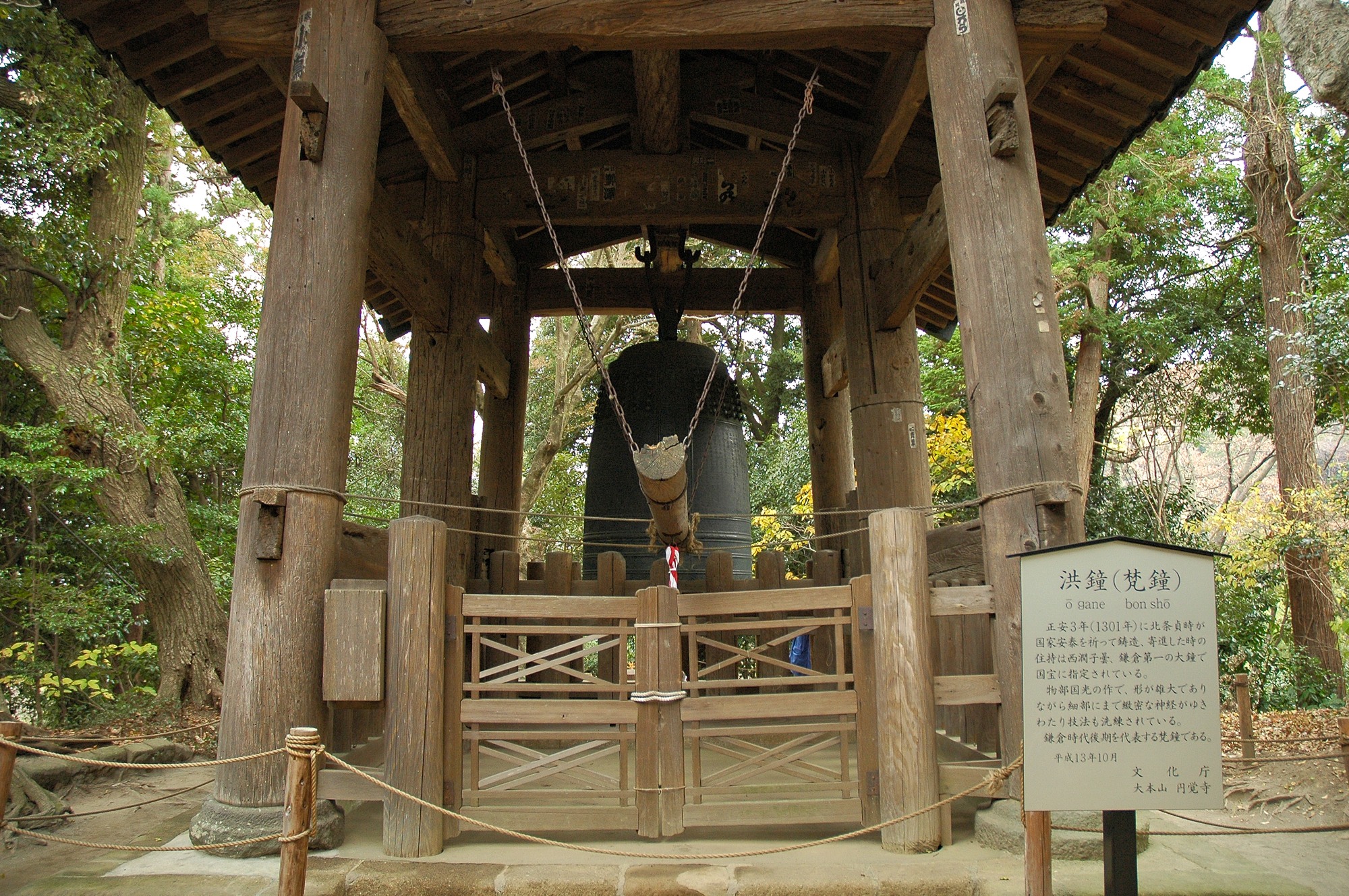 一通り撮影を終わらせて入り口の方へ戻ると、「国宝 洪鐘(おおがね)」との看板があったので見てみました。見ると洪鐘は別名「梵鐘(ぼんしょう)」とも言い、1301年に北条貞時が鋳造した鎌倉第一の大鐘であるとのことです。その向かいには「弁天堂」というのもありました。