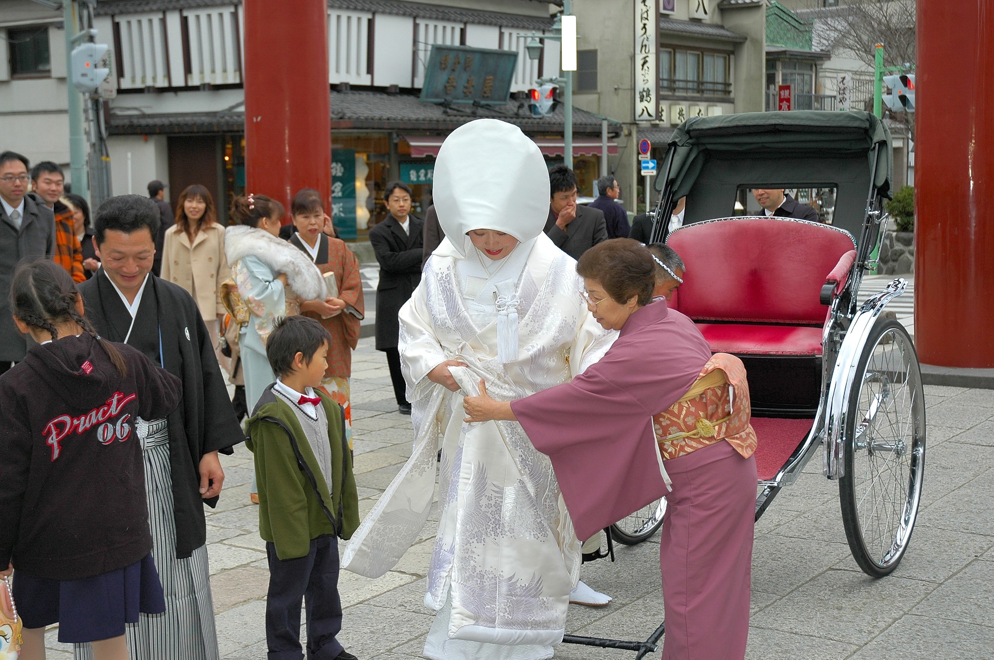 しばらく見て歩いたあと、また鳥居の外に出たら周囲の人々がざわめいています。何だろう、と思ってみていたら、何と、向こうから人力車が走ってくるのです。しかもそこに乗っているのは、おそらくたった今 挙式したばかり(それとも、これから挙式?)と思われるカップルでした。恥ずかしくないのかなあ、と思いつつ見ていたら、ちょうど鳥居の下に人力車を止めて、親族も交えて記念撮影していました。カップルの方はとても幸せそうで、うらやましく思いました。