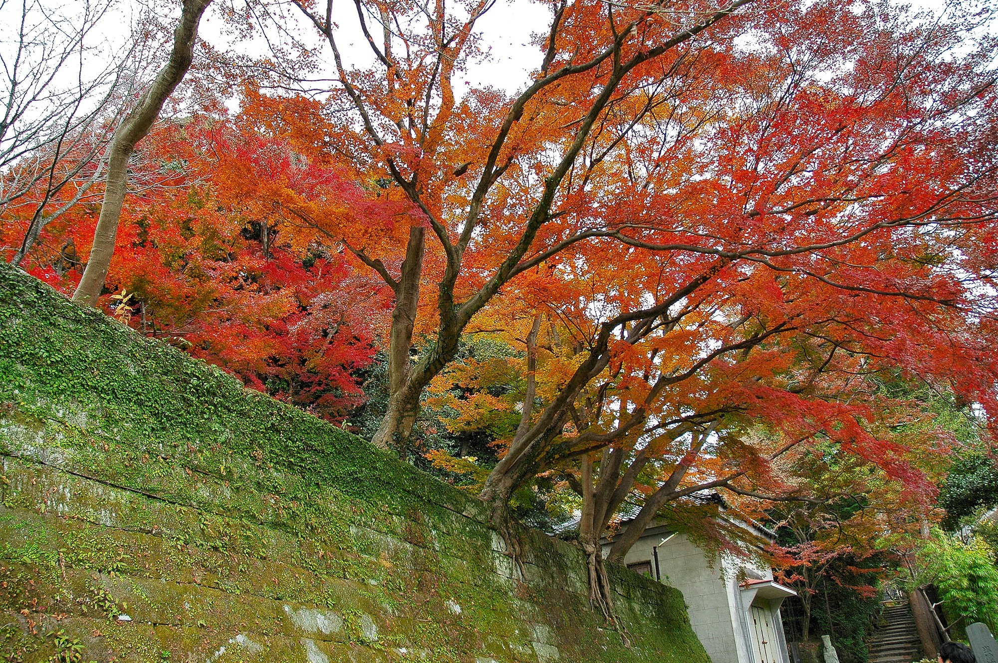 ここは知る人ぞ知る紅葉の名所ということです。場所的には鎌倉駅の北東方面、「鎌倉宮」の少し先になります。鎌倉宮の脇の狭い道を車で進むと、すぐ左側にテニスコートが見えます。ここは皇族の方々がよくいらっしゃるテニスコートとのことですが、見た限りは何の変哲もない普通のテニスコートでした。更に進むと住宅地になり、すぐ山のふもとまで来てしまいました。車はこれ以上先に入れないので、道路わきに車を止めて山道を歩くことになります。