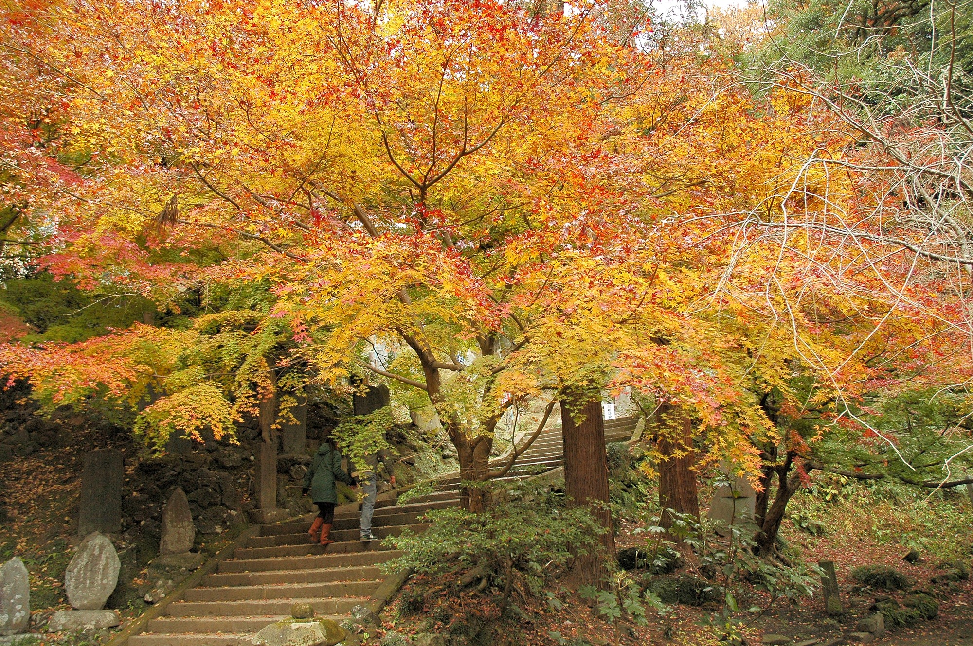 道の両側の紅葉を楽しみながら歩いてゆくと石段があり、そこを上ると祈祷所にたどりつきます。その石段の途中でも太陽の光を透過した紅葉がとても美しく、多くの人が写真を撮っていました。よく見るとここには外人さんが多く来ており、やはり同じように写真を撮りまくっていました。写真撮影が好きなのは、何も日本人だけではないようです。