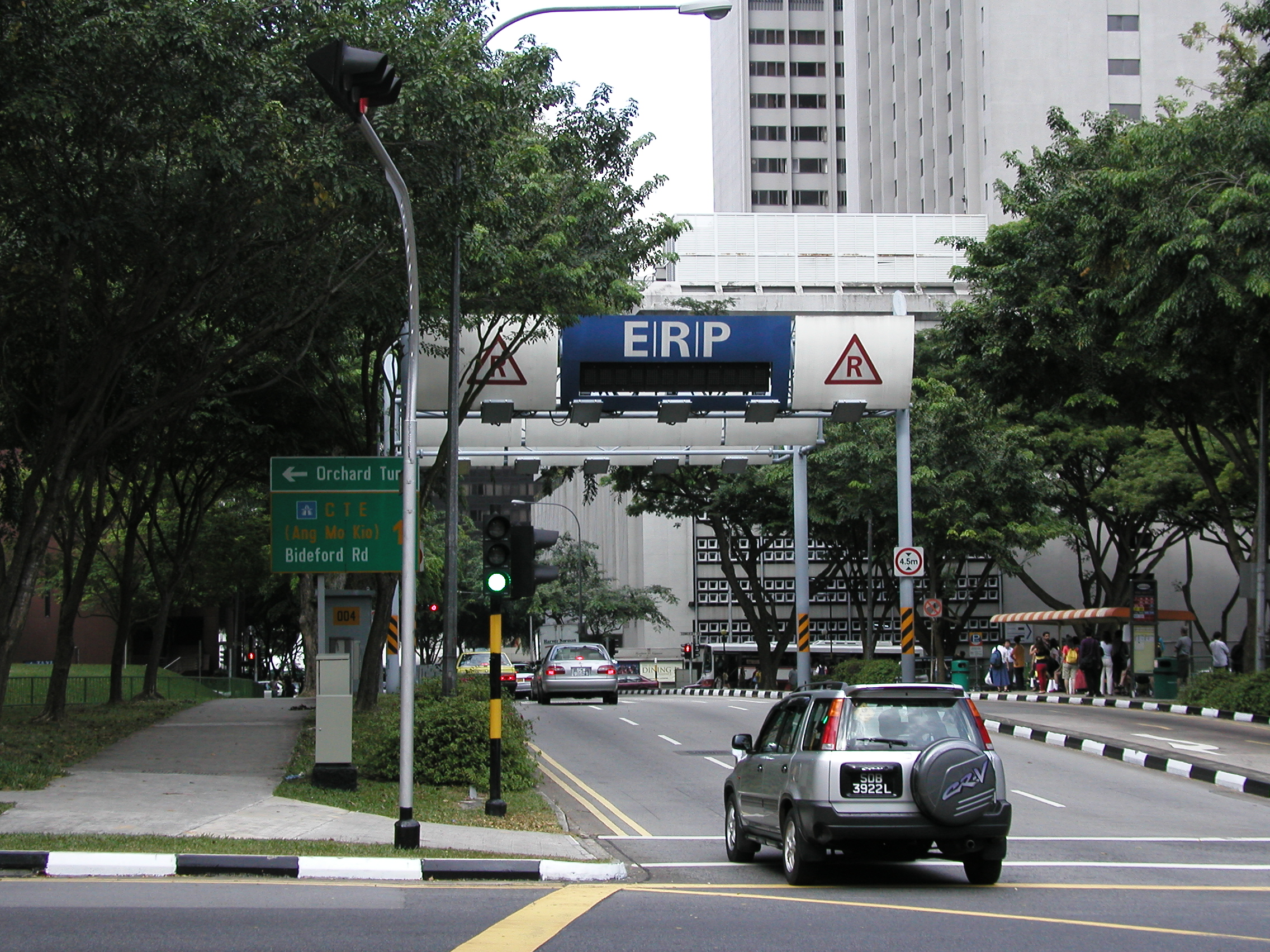 ERPとは Electrical Road Pricingの略(これも3文字ですね)で、ウイークデーに市街地中心部に入る車に対して渋滞防止の目的で自動的に料金を徴収するシステムのことです。