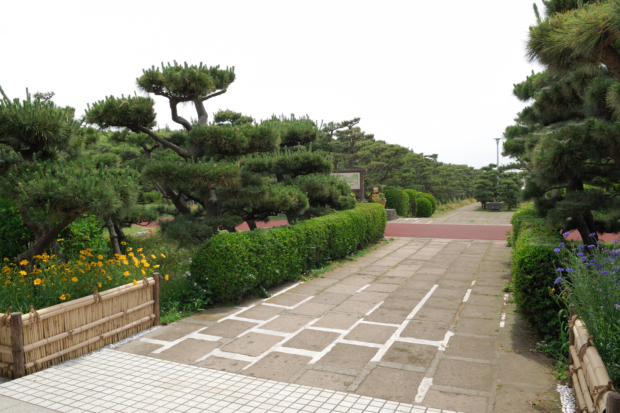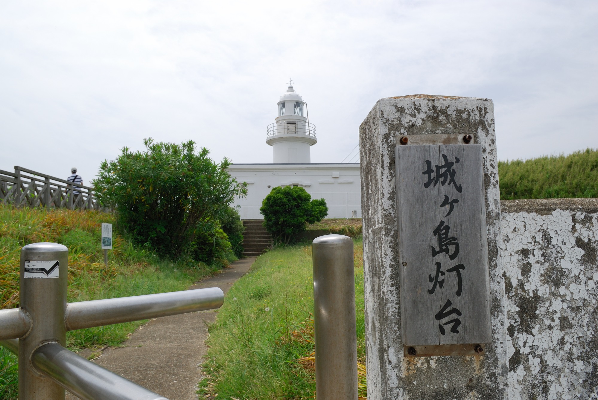 さて食べたら灯台見学です。灯台へ行くには,お店街の先にある急な階段を登っていきます。登った先には小奇麗な庭園と小さな池があります。そこからまた少しだけ階段を登ると正面に城ヶ島灯台が見えてきました