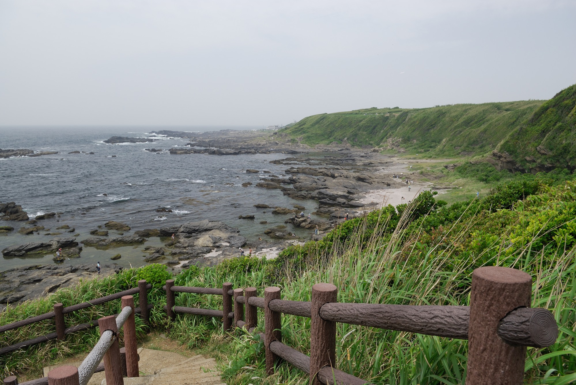しばらく歩くとようやく目の前が開けて海岸が見えてきました。海岸は岩場になっていますが,少しは砂浜もあり,人々がパラソルを開いてくつろいでいます。目指す馬の背洞門はここの端にありますので,ワクワクしながら海岸に向かって階段を降りていきました。