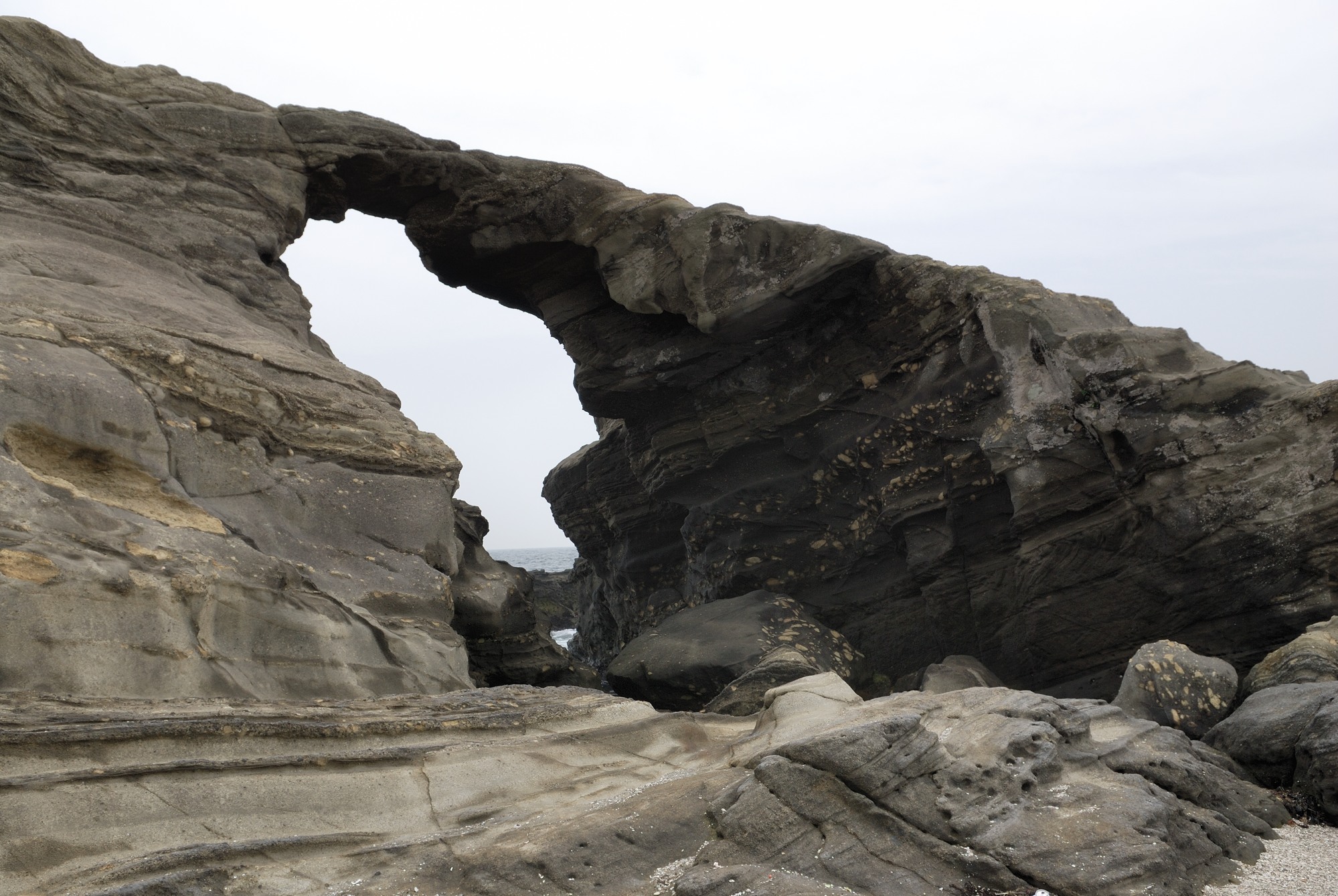 馬の背洞門は長い年月をかけて海水が浸食して出来た,不思議な形をした岩石の洞門で,馬の背中に似ているのでこの名前が付いています。下から見上げると非常に大きく,下に入ると崩れてきそうで怖い感じ。高さは8mとのことです。