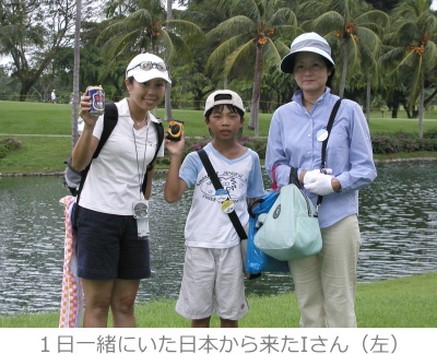 そこでその女性に聞いてみたら、昨日見に来た時に長男がちょっとはぐれ、その時にたまたま近くにいて知り合ったらしく、「今日も会えたね、お姉ちゃん」などと話していました。この方はIさんといい、TigerSkinを見るためにシンガポールにいる両親をたずねて日本よりわざわざ来たくらいのゴルフ大好きな方で、本日は一日一緒に見て回りました。長男にも優しく、非常に真面目ないい方でした。