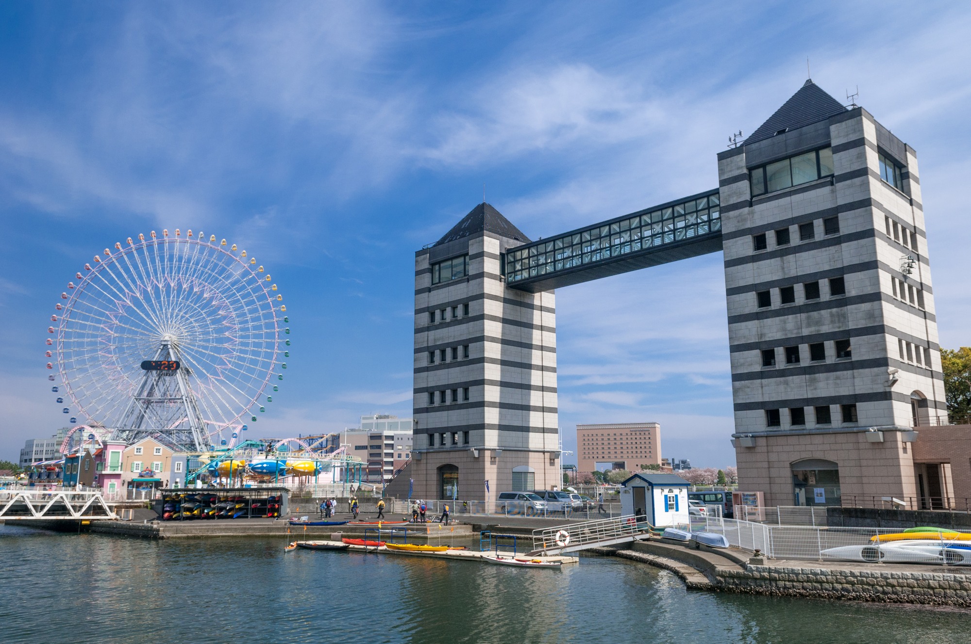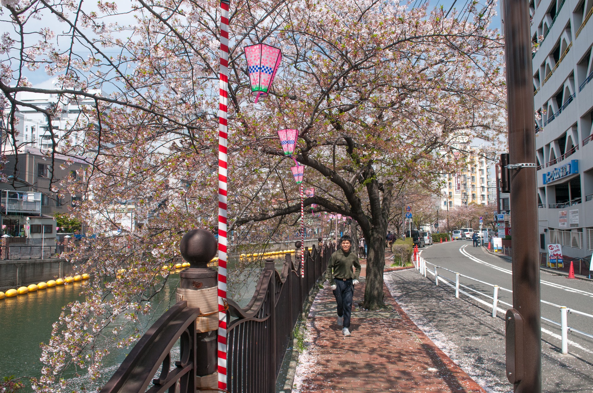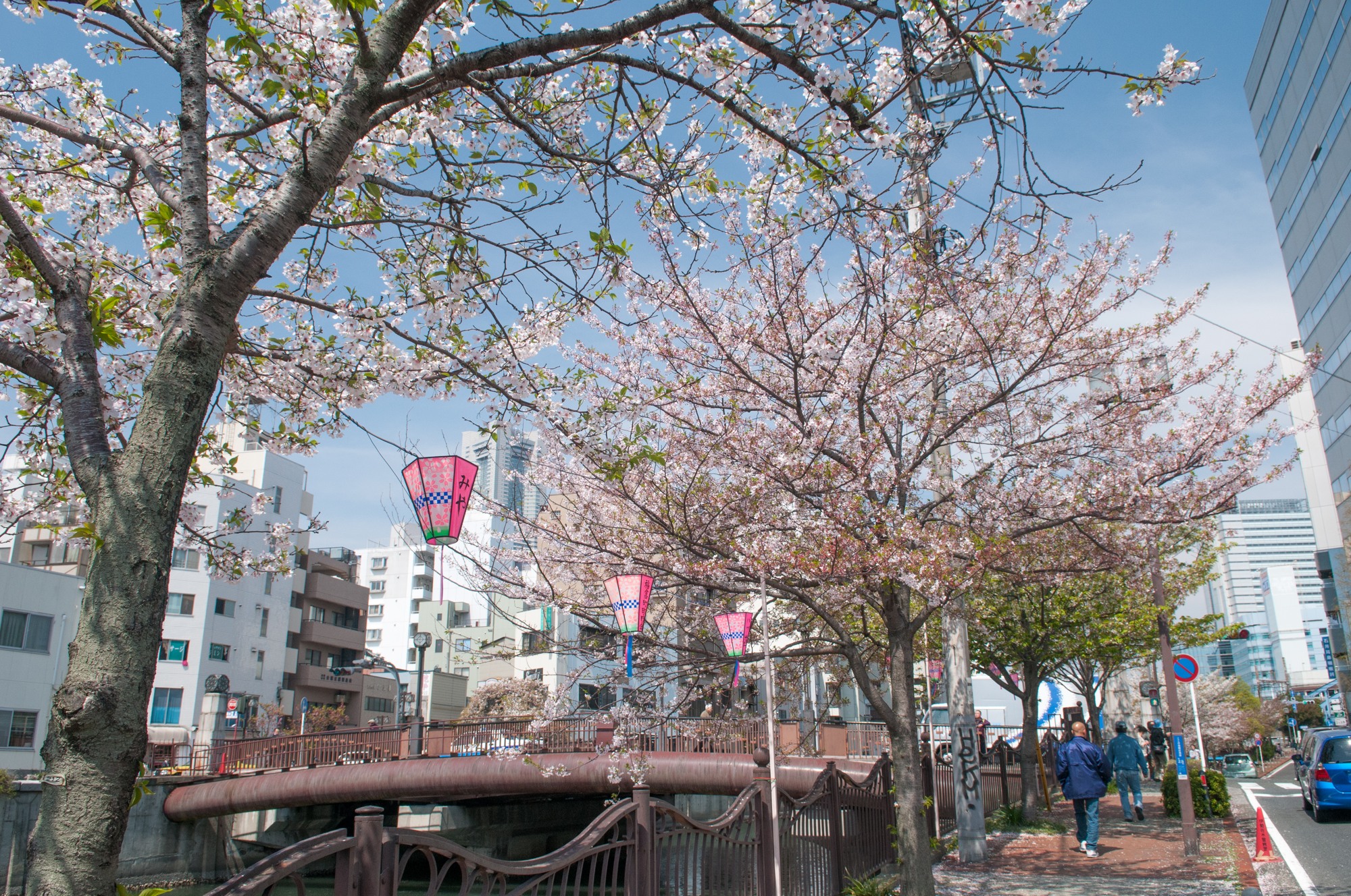 さて景観を楽しみながら歩いていくと、桜の花の向こうにランドマークタワーが見えてくるので、もう河口は近いことが分かります。