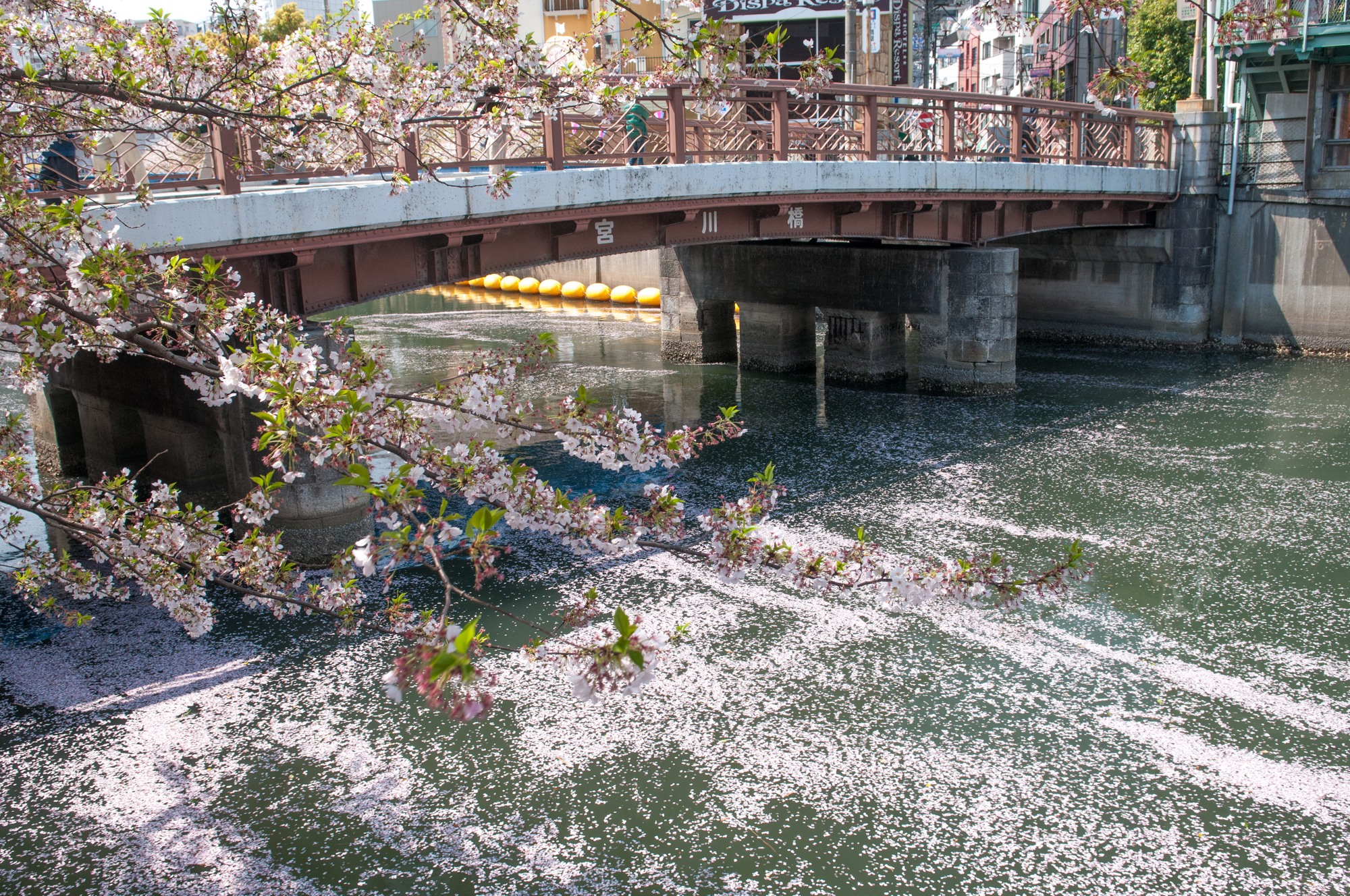 さてこの辺りで気付きましたが、桜の花が散って川の上に多く浮かんでいます。しかも花紋とでも言うのでしょうか、色々な模様を作っていて、見ていてとても綺麗でした。これは誠に絶景です。