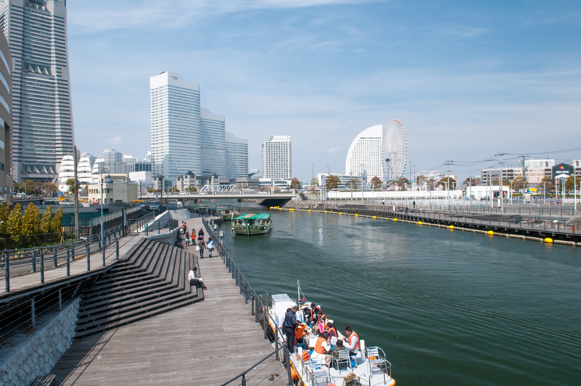 ここまで来ると川に沿った桜並木はなくなり、すぐに大通りを超える歩道橋を渡ります。眼の前はJR桜木町駅になります。更に進むともう大岡川の河口になり、そこには船着き場がありました。先程見た屋形船や観光船はここから発着しているようです。