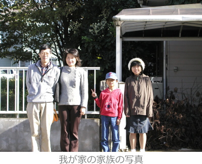 この写真は2001年11月に帰国した時、年賀状用に家の前で撮影しましたが、結局面倒くさくて年賀状には使っていません。左から、お父さん、お母さん、長男、長女と並んでいます。
