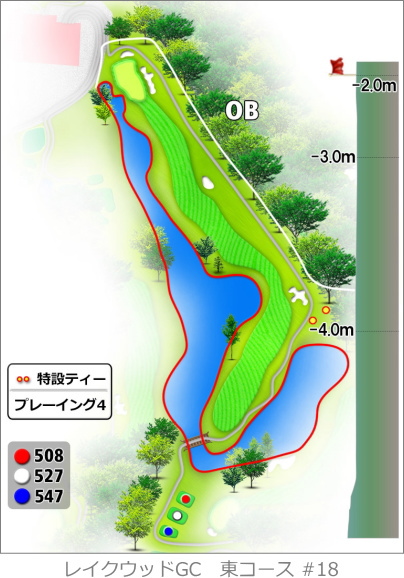 ここは一番の名物ホールで左ドッグのロング。ティーグランドからは左右に池、セカンドは大きく左に回りこみ、まず池超えのショットがあり、しかも右は延々とOBゾーンが続く嫌なホールである。前回来た時はティーショットは真っ直ぐ飛んだがセカンドで3回続けて右OBをやらかしてしまっていた。