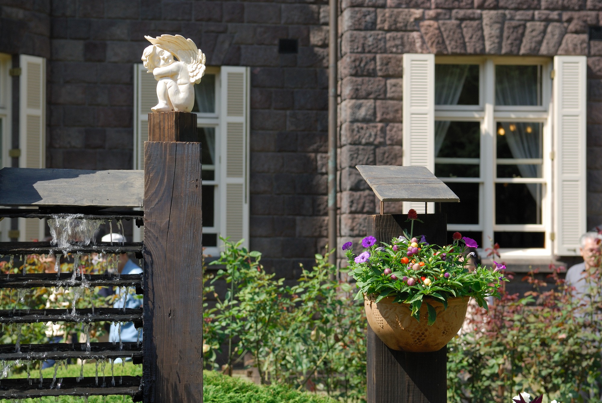 よく見ると花壇の中には作り付けの滝がある飾り物があり,その上には天使の飾り物があります。隣には花を飾ったバスケットもあり,とても可愛かったのが印象的でした。しばらくその近辺で撮影を楽しんだ後は,洋館の裏手に回って見ます。