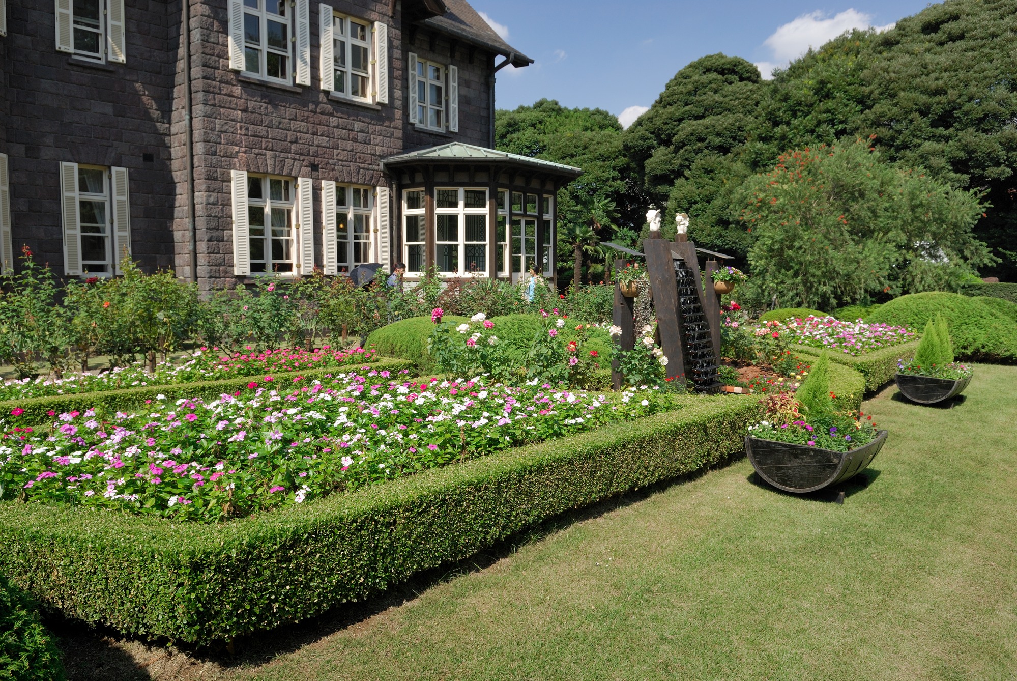 入るとすぐ正面に洋館が見えます。入り口から見えるのは洋館の横サイドですが,その正面には花壇があり,多くの花が咲いていました。色もバリエーション豊かで,皆で写真撮影していました。