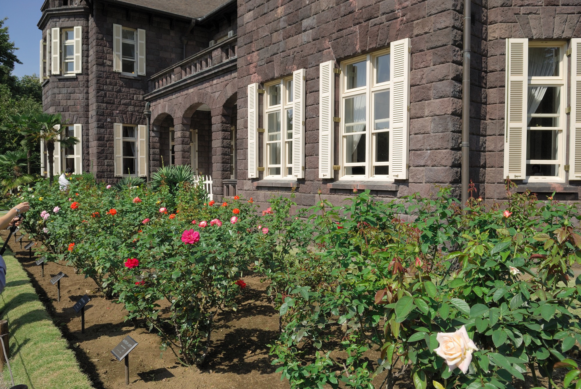 そのまま洋館の正面に向かうと,そこにも色々な種類のバラが咲いていました。赤,白,黄と,いずれも綺麗です。まだ時期的には少し早かったせいか,咲いている花の数はちょっと少なめでした。