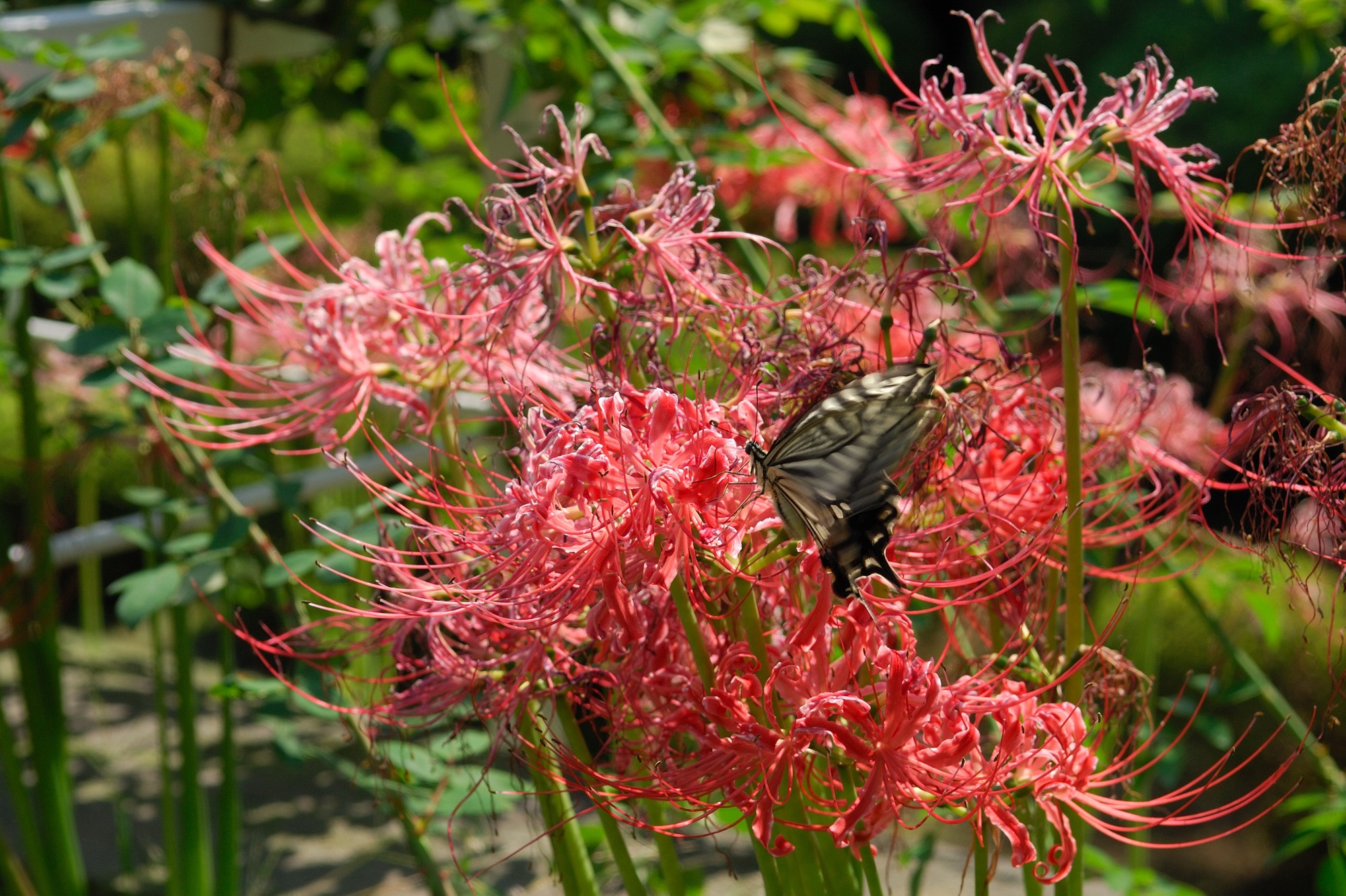 その前には綺麗な赤い彼岸花も咲いていたので,近づいて写真を撮ろうとしたら,偶然,アゲハ蝶が飛んできて花に止まりました!