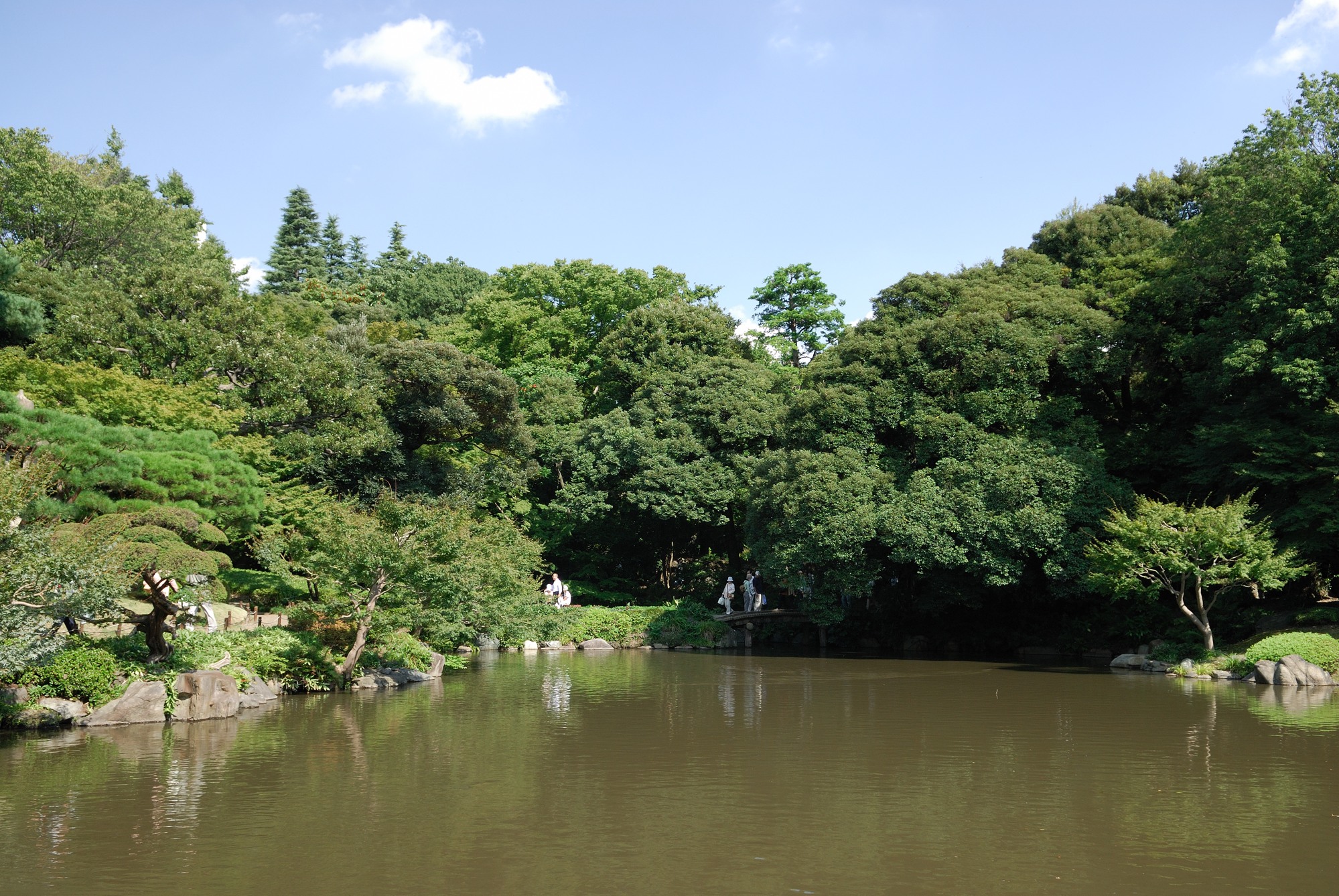 うっそうとした林の中を抜けると,その先には大きな池を中心とした日本庭園があります。この庭園は,京都の庭師で有名であったという小川治兵衛の手によるもので,大正初期の庭園の原型をとどめる貴重な存在なので,国の名勝に指定されています。