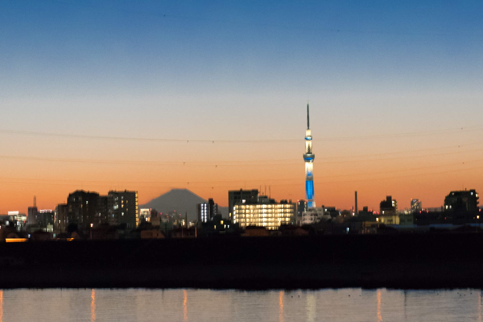 夕暮れの東京スカイツリーと富士山(少しブレていますが)