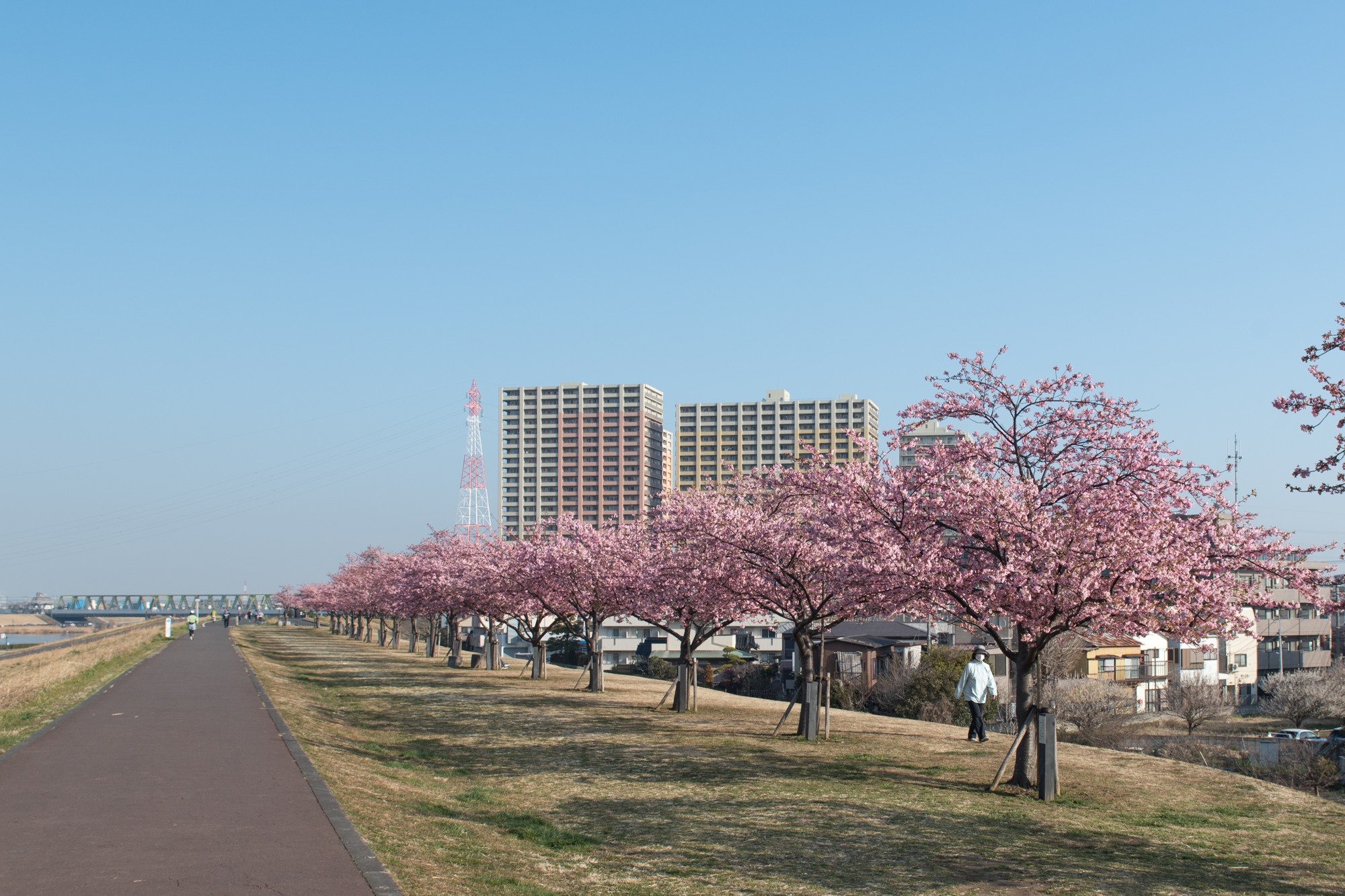 この江戸川の向こうは東京都なので、市川は千葉県の一番端っこになります。また、江戸川の堤防は結構いいお散歩路になります。