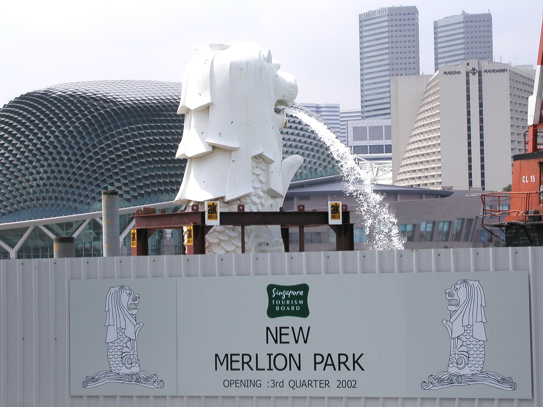 でも良く見るとまだ工事中であり、手前には「NEW MERLION PARK」の看板があり、オープンは 3rd Quarter 2002となっていましたので、今年の9月に正式にオープンすることになります。しかしついに「口から水を吐く元祖マーライオン」を見ることが出来て本当に感激でした。正式オープンの暁には、また必ず見に来ようと思います。