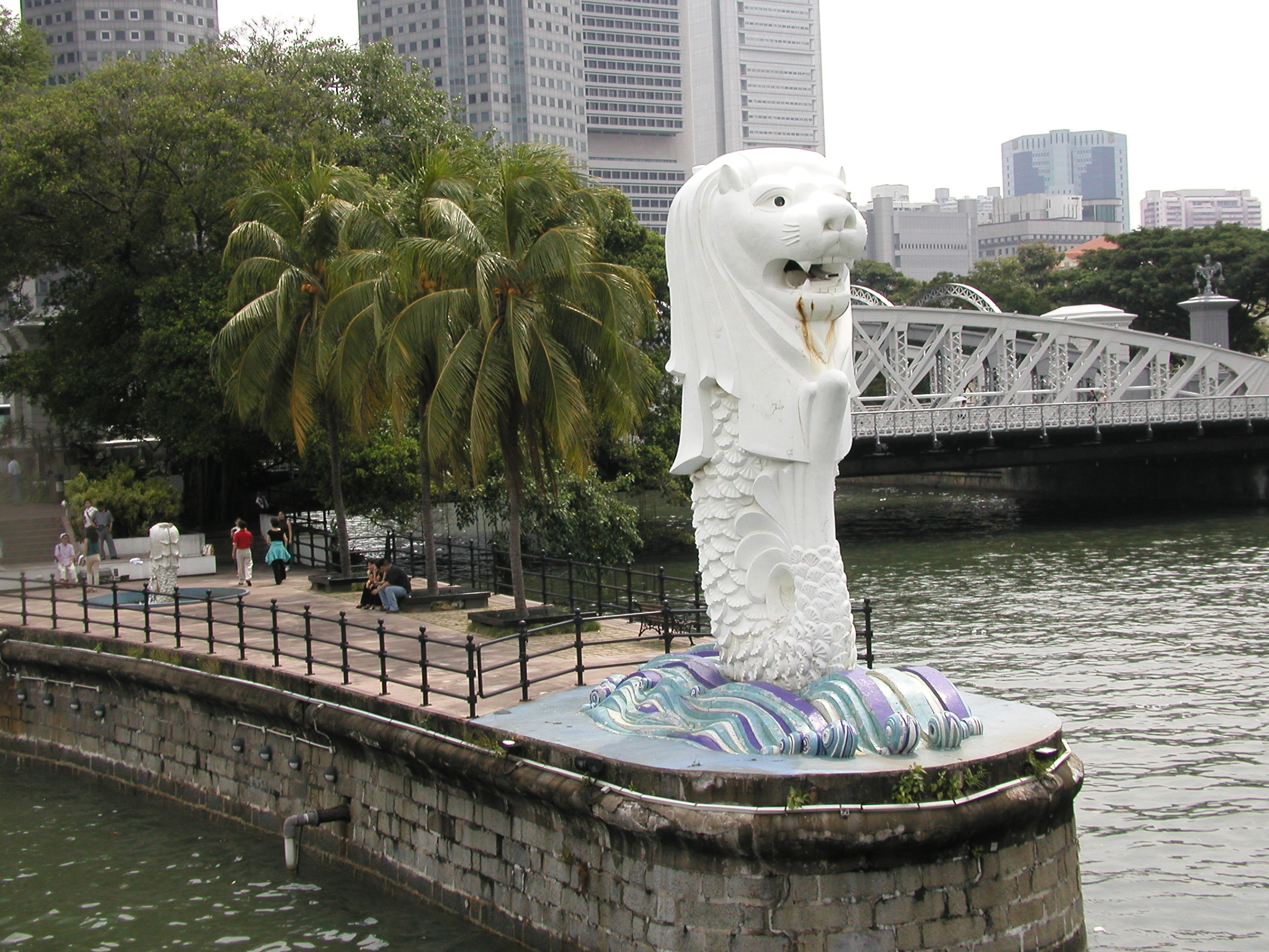 もともとシンガポール・リバー河口のマリーナ・ベイ沿いに建っていたのが、前に大きな橋がかかったため遠くから見えなくなったので、いずれ引越しするとの噂は以前よりありましたが、今回、2002年4月についに引越しすることとなったものです。場所は橋をはさんだ海寄りの広場です。