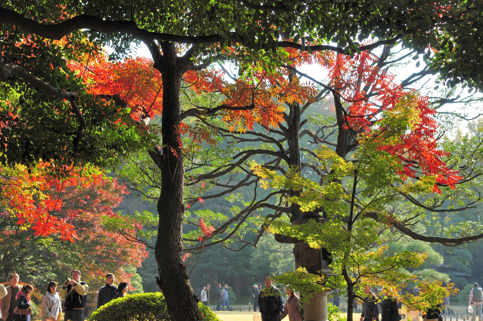 さすがに紅葉シーズンということもあり,人がたくさんいました。入って正面に大きな池が見え,その手前にはいくつかモミジがありましたが,一部は太陽の光が透けて見えてとても綺麗でした。