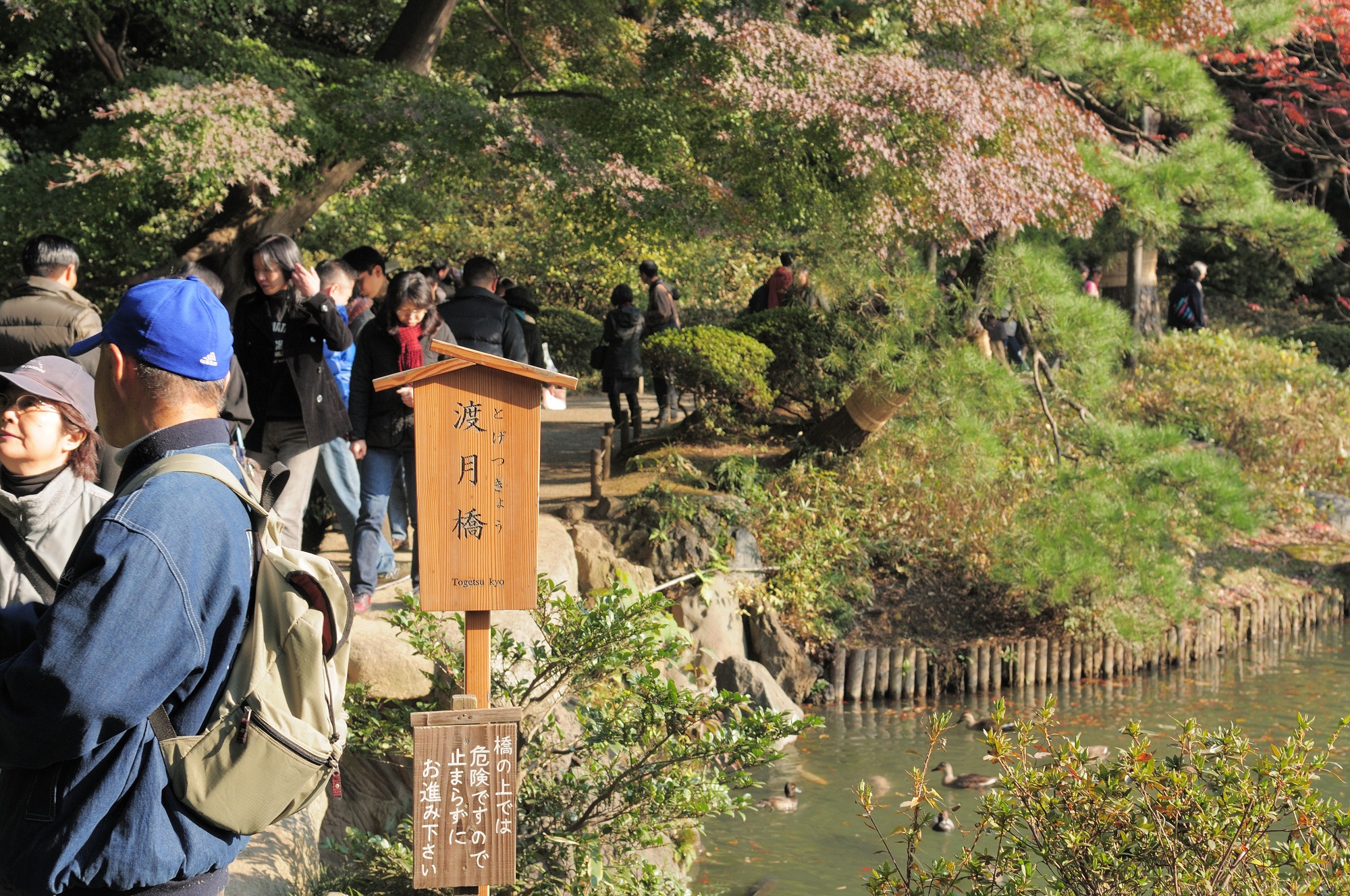 その先には渡月橋(とげつきょう)という小さな橋がかかっており,その下にはお約束(?)の鯉とカモがいました。