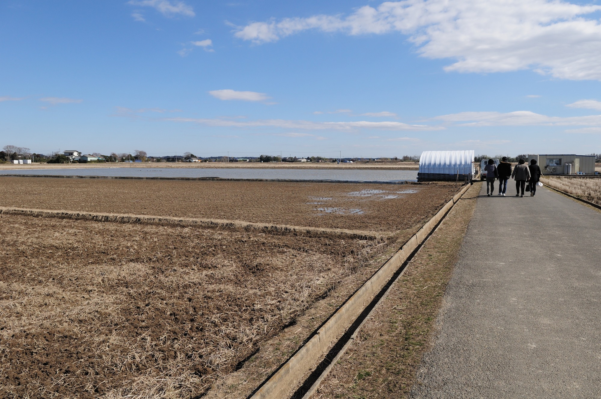 田んぼの中を歩いてゆくと,先の方に広い貯水池が見えます。そこは白鳥が来るようになってから田んぼの1つをつぶして貯水池にしたそうです。楽しみにしながら近くまで行きますが,意外と人は来ていません。事前にWEBで調べたら,かなりの人が見に来ているはずですが・・・。そう思いながら近づいてゆきますが,どうも白鳥の姿が見えません。
