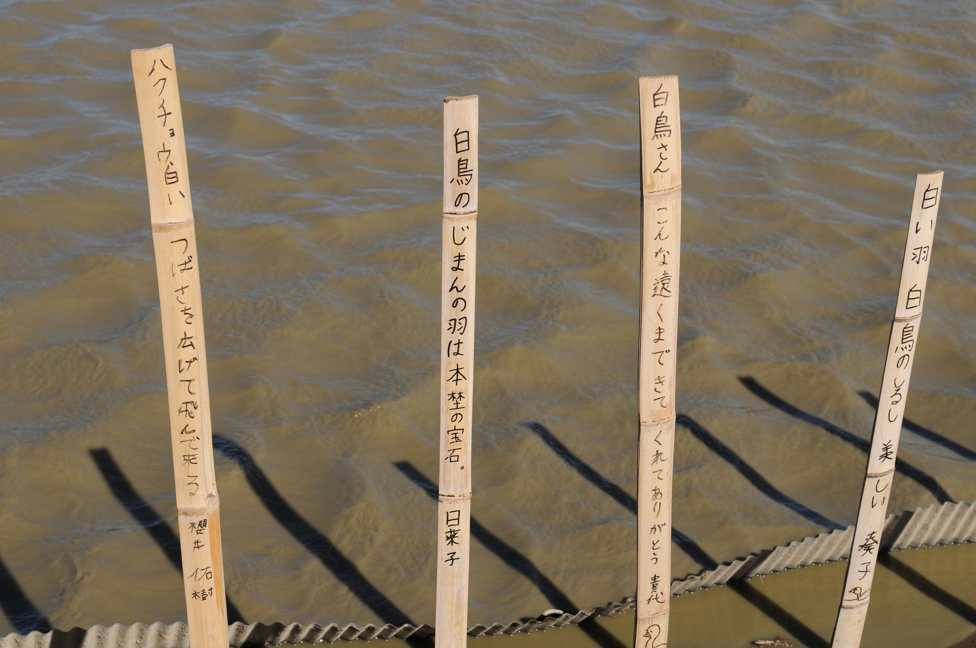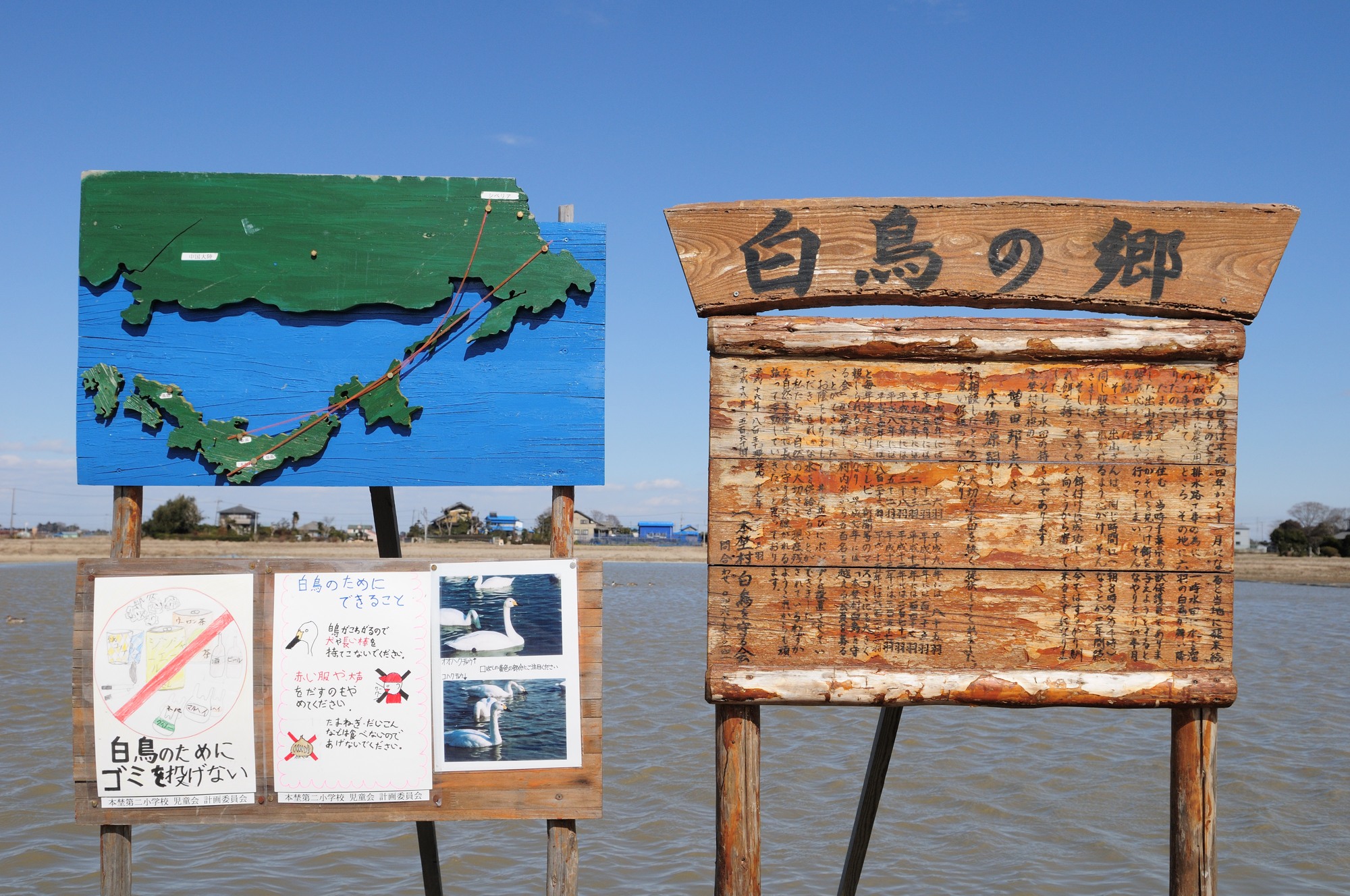 貯水池の前には,白鳥の郷と書かれた看板や,子供たちのメッセージが書かれた書いた縦看板がありましたが,肝心の白鳥がいないのではがっかりです。