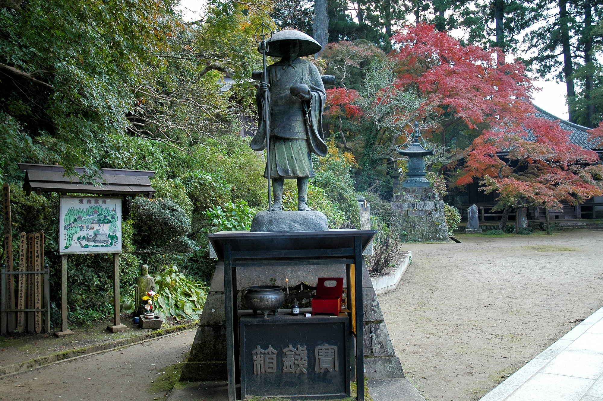 入ってすぐに見ることが出来るのは、伊能忠敬の銅像です。そしてその右側には本堂があります。問題の紅葉は、やはりまだ少し早かったのでしょうか。かすかに色づいている感じでした。