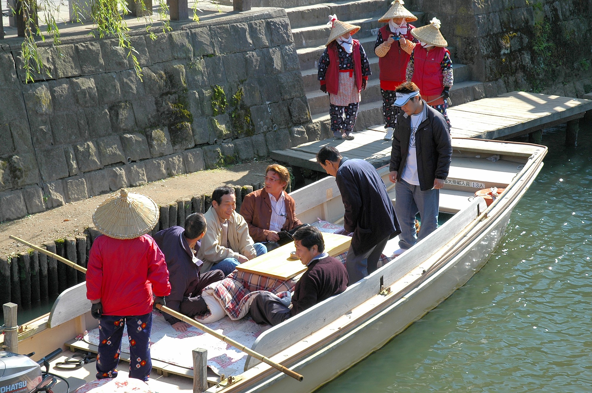 さてそろそろ小野川を離れることにします。帰り際に見たら、ちょうど観光客の人たちが舟に乗るところでした。