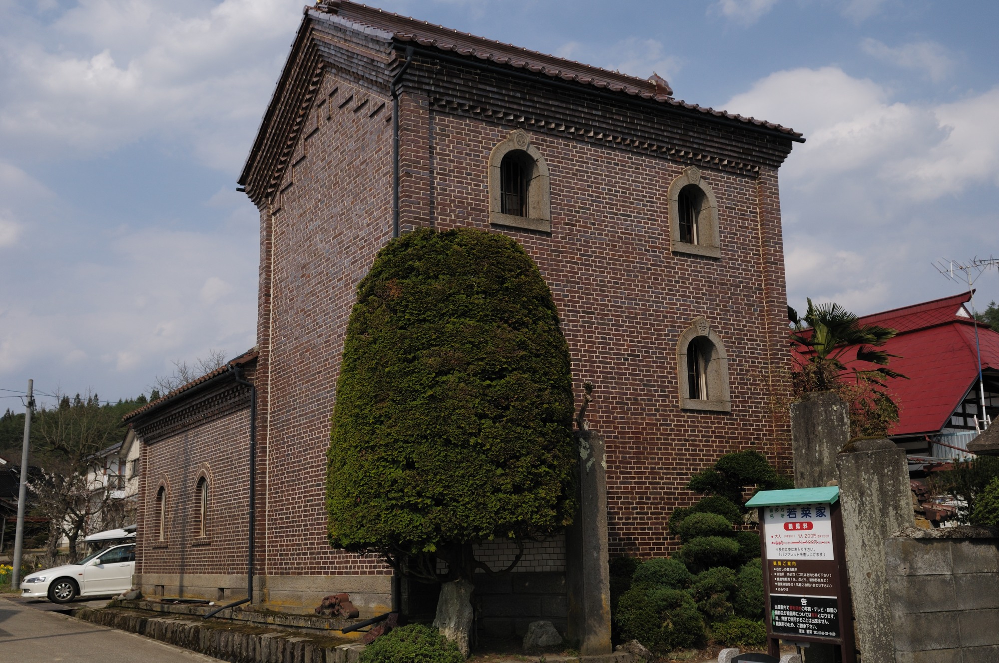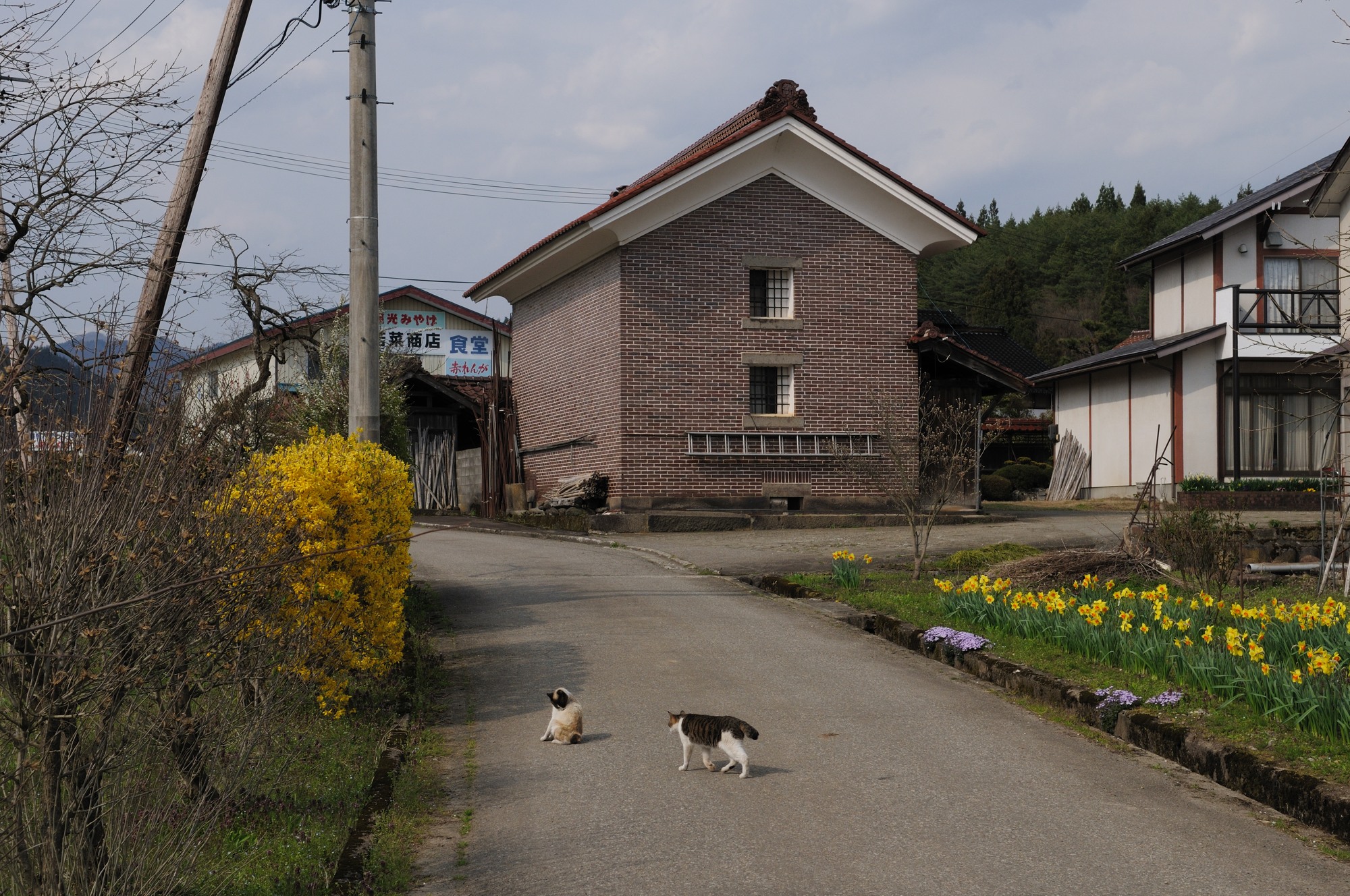 「三津谷集落」には蔵は5軒しかありませんが、ドイツ人鉱山技師が設計した珍しいレンガ造りの蔵があります。全てが若菜家の資産のようで入場料を支払って中に入ることも出来ますが、今回は外から見るにとどめました。GW中にかかわらず見に来ているのは我々ともう1組なので、ゆっくり見ることが出来ます。とても静かな所で、猫がのんびり道を歩いているのがご愛嬌でした。