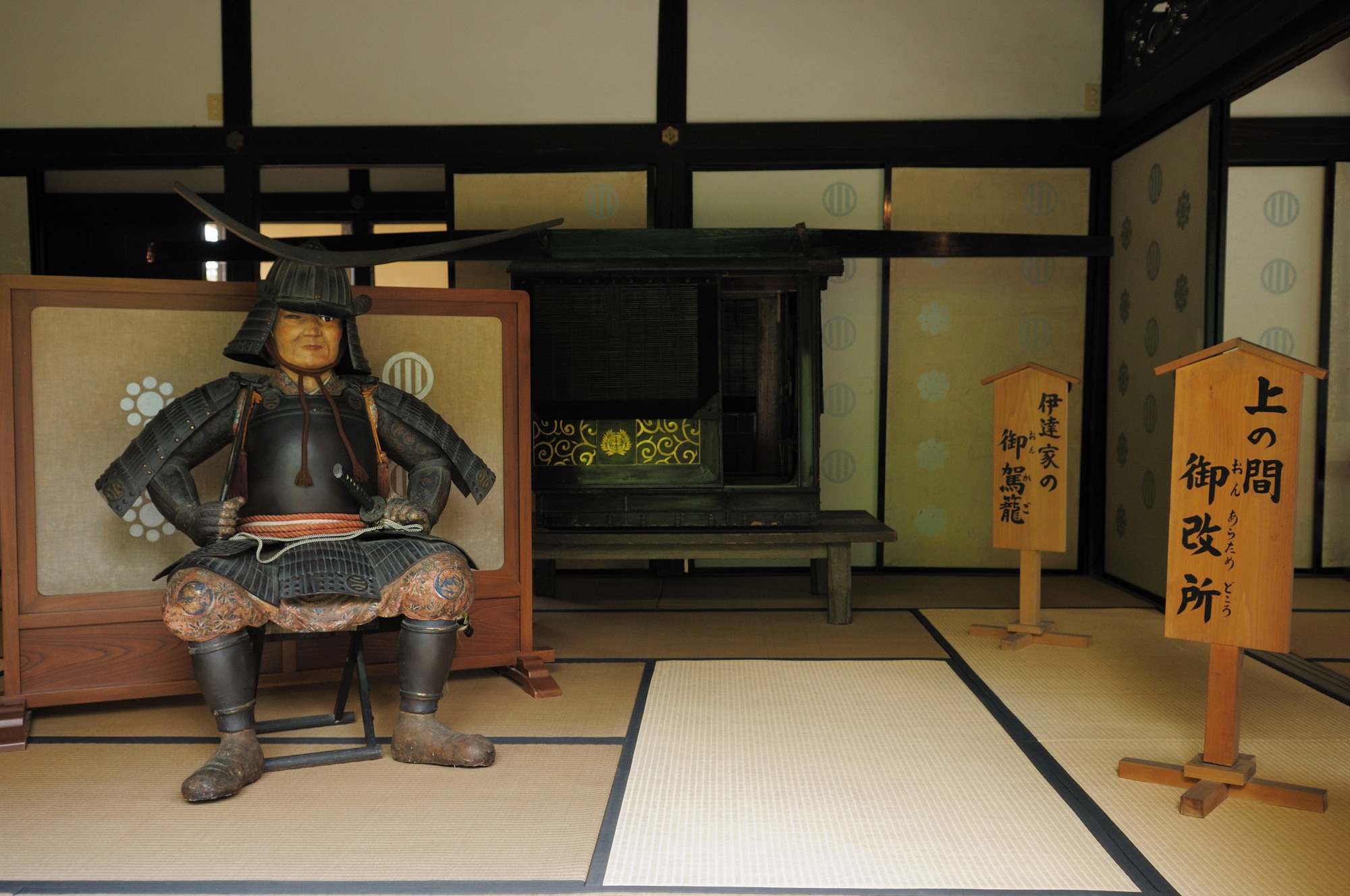 主屋の中には、伊達家のかごとともに鎧を着た侍の人形が飾ってあります。なぜかウインクしています。