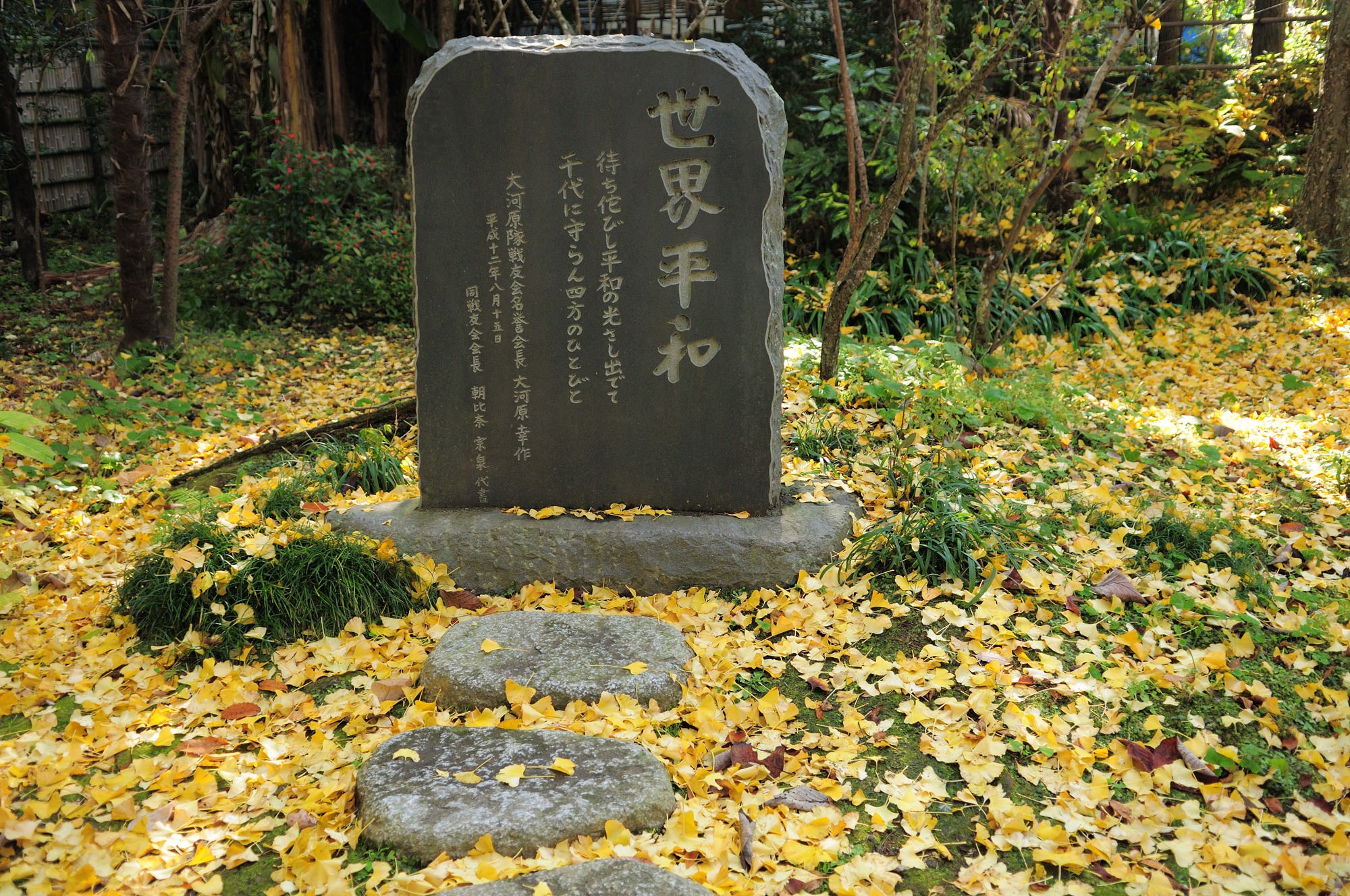 入るといきなり世界平和の碑があり,あたりはイチョウの落ち葉がいっぱい。とても綺麗。いきなり感動します。