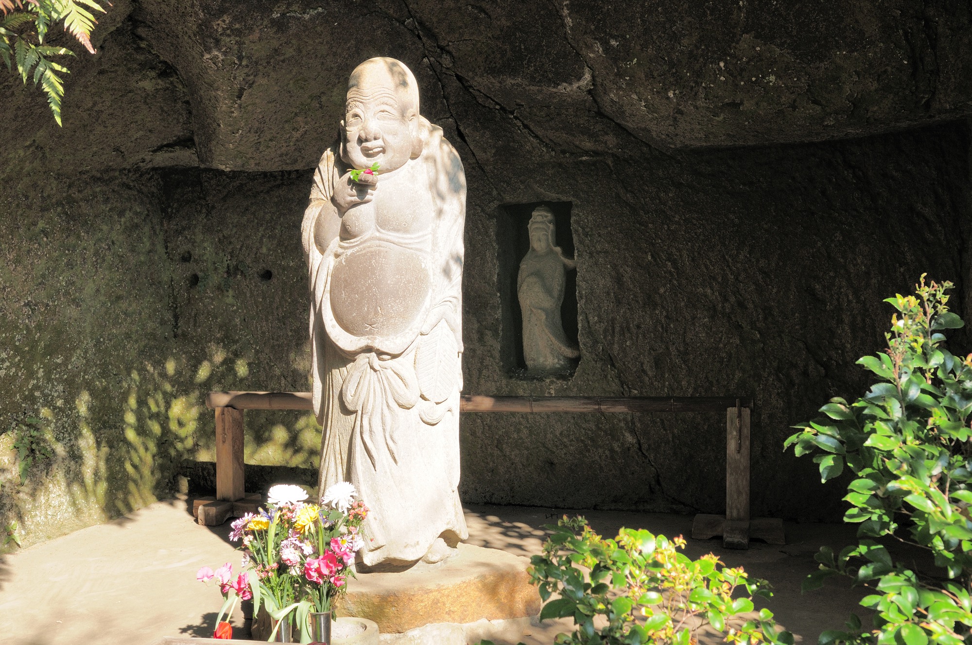 奥に進むと,相当古くに掘られたという横井戸などがありましたが,面白かったのは,触ると幸せが舞い込むと言われる布袋尊(ほていさん)です。狭いトンネルを抜けると,その突き当りの洞窟の中に立っています。高さは結構高く,人間並みです。私も実際にこの布袋尊をさすってきましたので,今後いいことがあるでしょう!