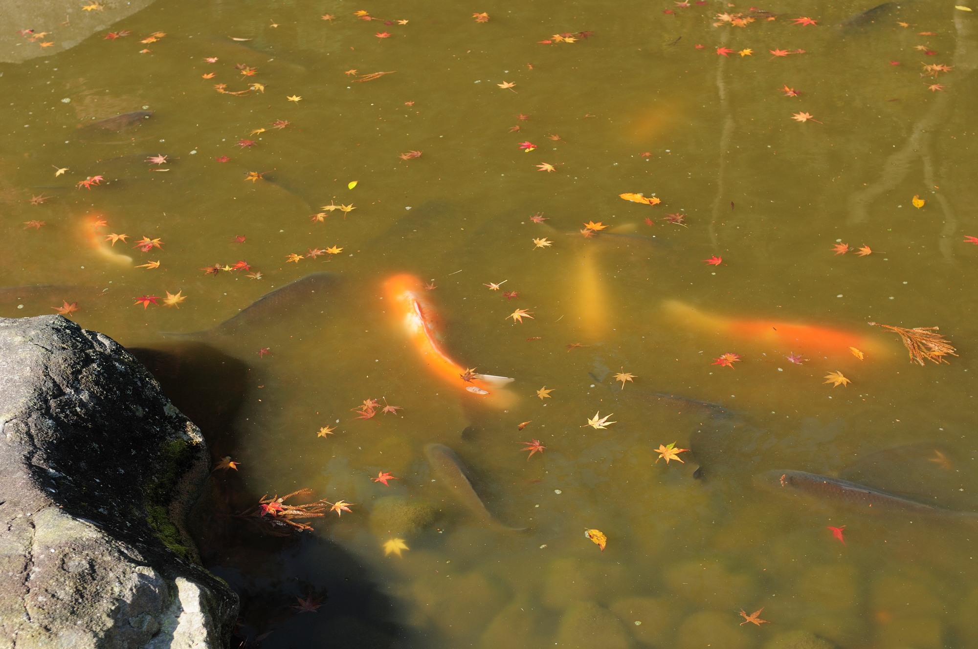 さて右手に古い日本家屋を見ながら進むと,その先には舎利殿がありますが,その手前の池には,お約束の鯉が泳いでいました。散ったモミジの葉の間を縫うように泳ぐ鯉,絵になります。